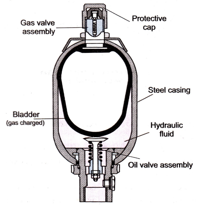 Khí Nitơ được nén trước vào túi cao su với 1 áp suất nhất định. Dầu thủy lực sẽ nén vào bình ở phía ngoài túi cao su.